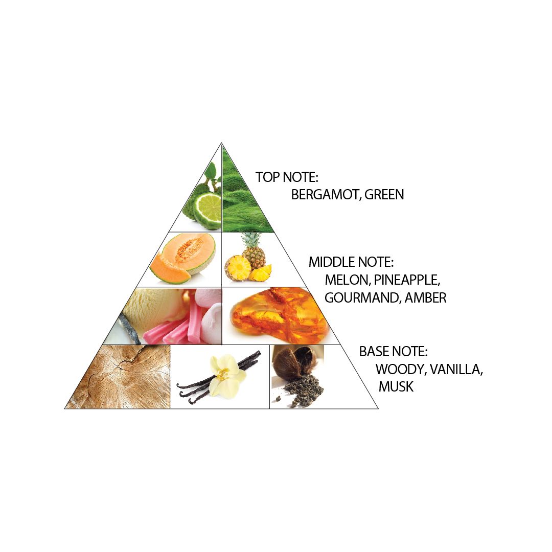 Middle notes: Melon, Pineapple, Gourmand and Amber